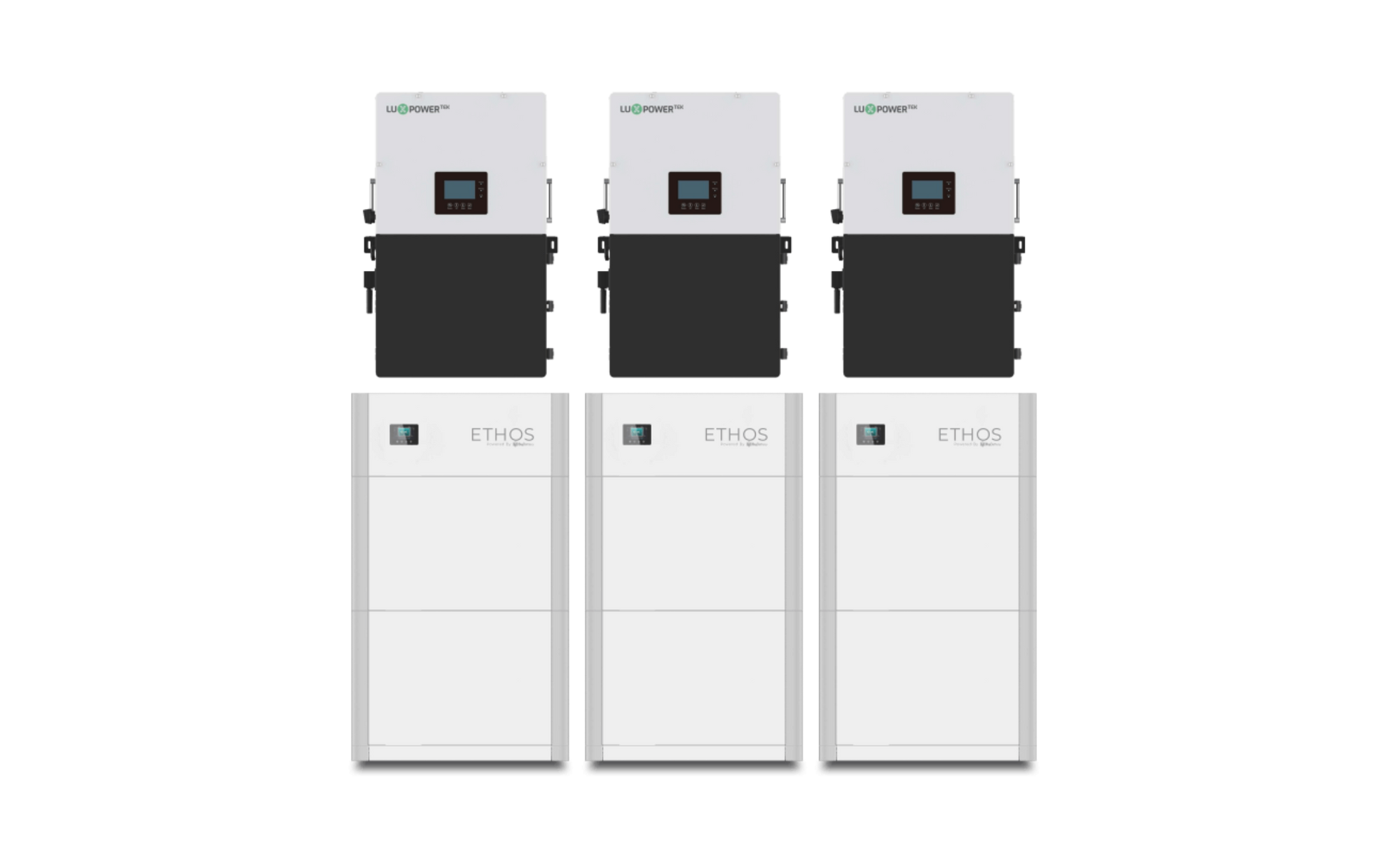 But that’s not all. We pair this ETHOS system with 3 cutting-edge 12000W Lux inverters, which feature their own LCD touch screen displays, 3 MPPT inputs each, integrated UPS modules for seamless on and off-grid switching, and the ability to handle PV arrays of up to 54000W. Plus, through their smart load control, AC coupling abilities, and peak shaving functions, you can meet your power needs and protect your business against unstable grids or rolling blackouts, while seeing huge savings each month on your electric bill.