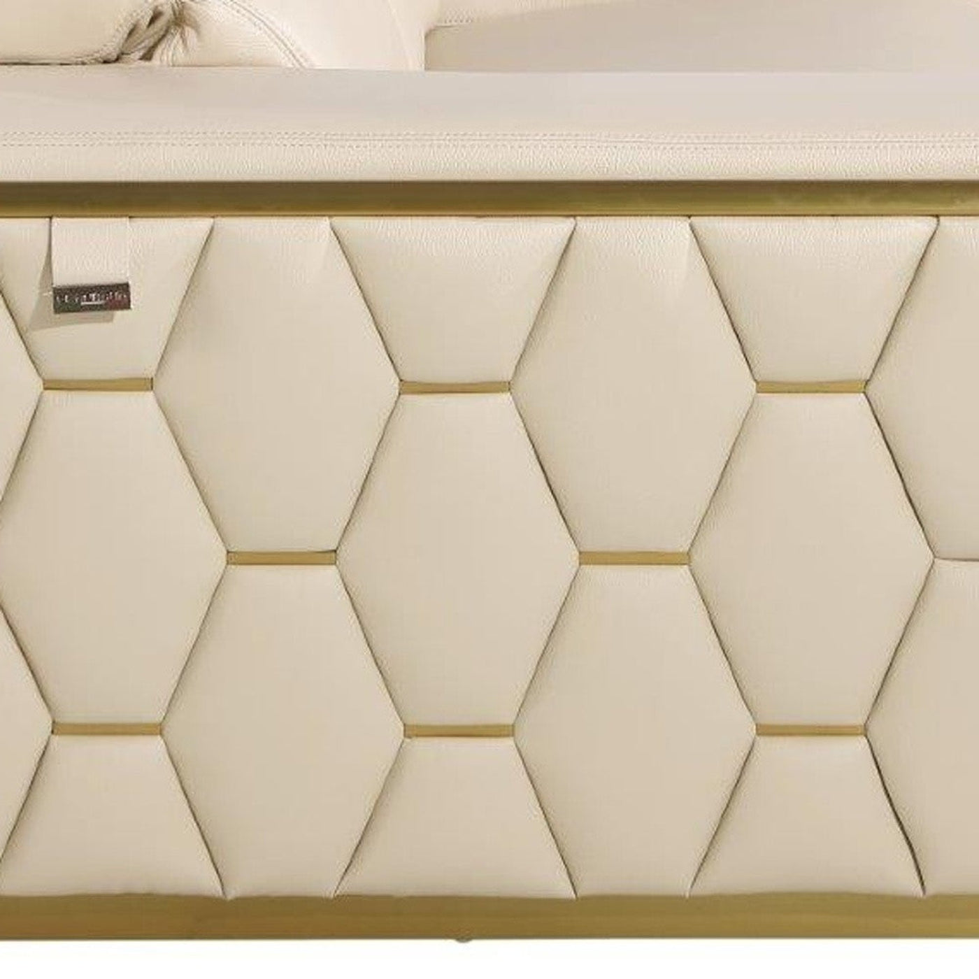 A: With its luxurious Italian-inspired design, tufted stitching, and wide arms, this sofa combines sophisticated beige leather with striking gold accents to elevate any living room or lounge area.