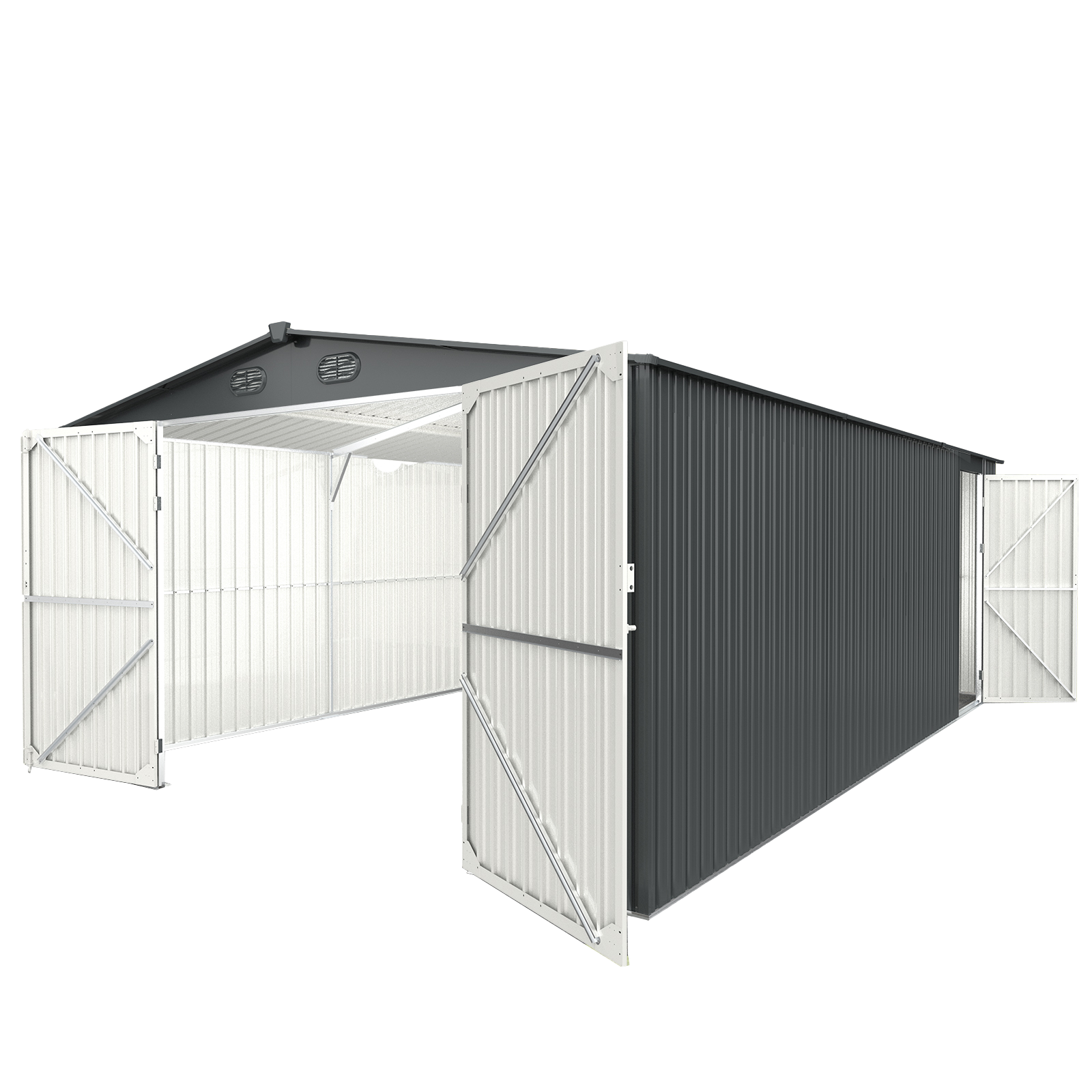 The **[AS-IS] 13'x20' Metal Garage Shed with Double Front Doors** is available for NC pick-up only. It was damaged during transit to North Carolina, but the structure remains intact. Some parts may show signs of impact, though it can still serve as a functional storage solution. Priced to reflect the condition, perfect for those who need a budget-friendly option.