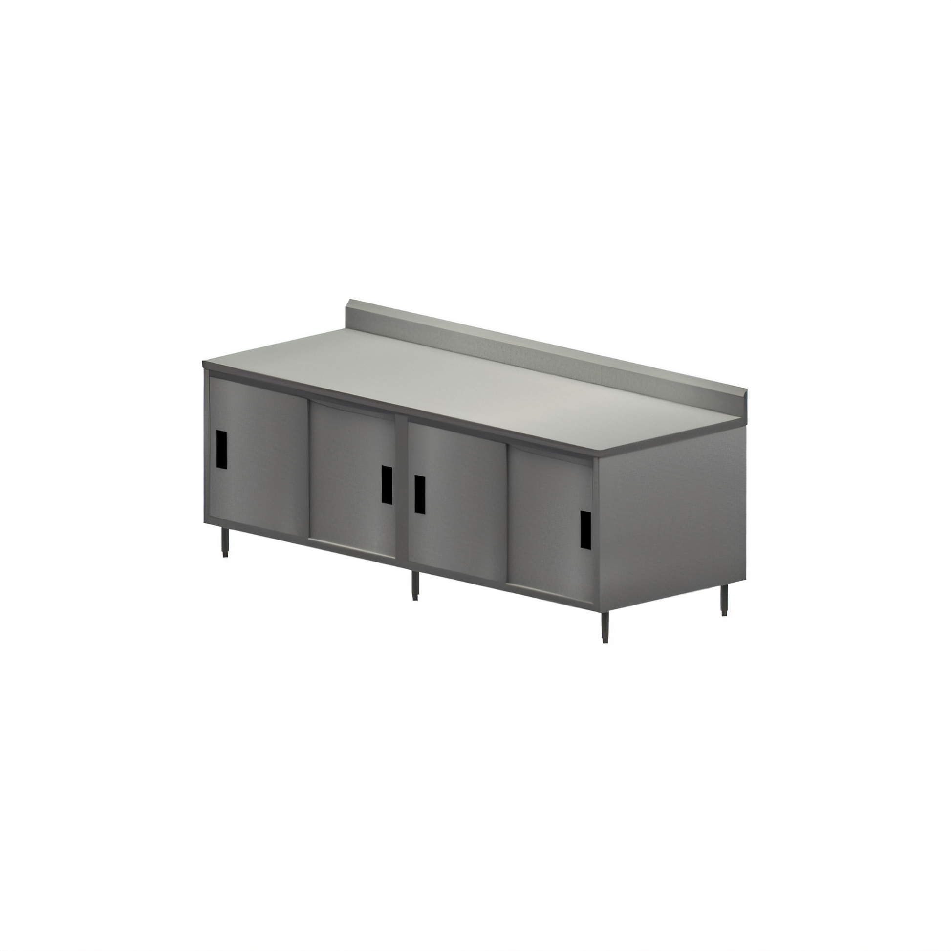 A: 14-gauge 304 stainless-steel top with a 5" back riser, supported by an 18-gauge 304 stainless-steel cabinet base and 6" adjustable stainless steel legs.