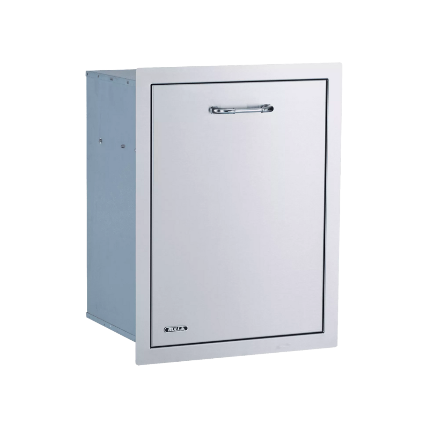 Pull-out stainless steel trash drawer keeps outdoor kitchens tidy.