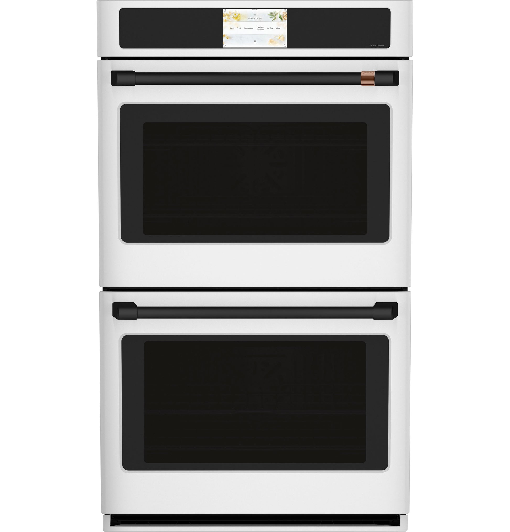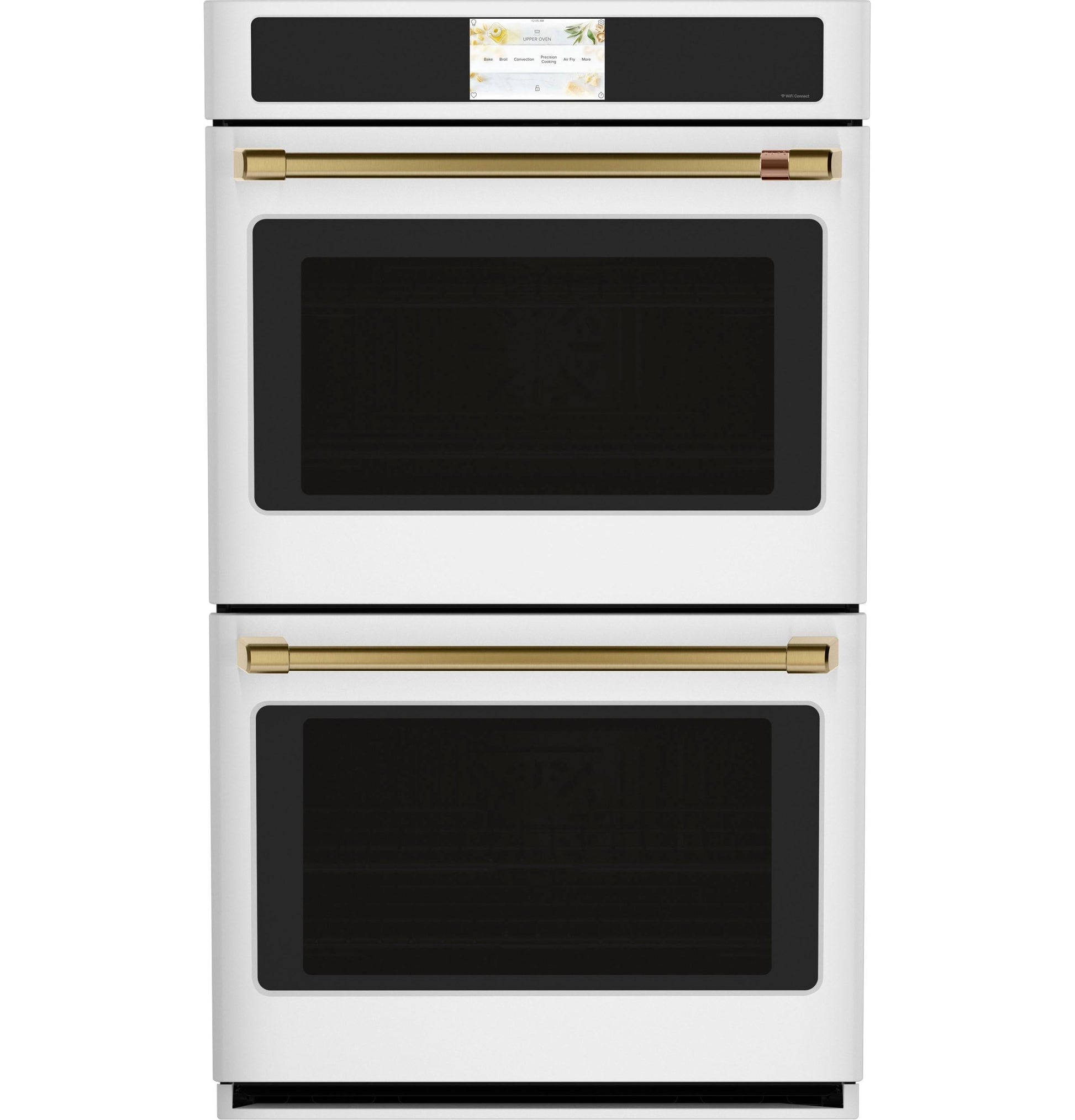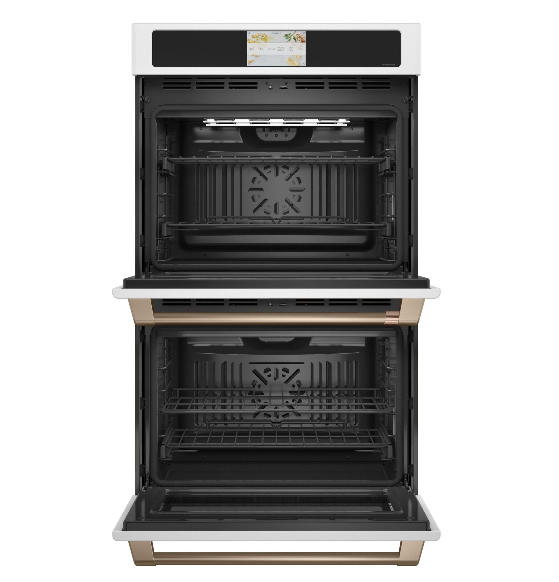 Elevate your culinary endeavors with the Café Professional Series 30" Smart Built-In Convection Double Wall Oven (Model: CTD90DP4NW2). This appliance offers a blend of style and functionality, featuring a Matte White finish complemented by Brushed Bronze hardware. The oven's No Preheat Air Fry and Dehydrate Setting provide innovative cooking methods, allowing you to prepare healthier, crispier dishes without preheating and create homemade dried snacks with ease. The In-Oven Camera lets you monitor your food's progress remotely via the SmartHQ app, ensuring perfect results without opening the oven door. Precision Cooking Modes automatically adjust settings for optimal outcomes, while the True European Convection with Direct Air system ensures even heat distribution for consistent baking and roasting. The Soft-Close Door enhances the kitchen environment by reducing noise and preventing slams. With built-in WiFi, you can control and manage your oven from anywhere using your smartphone or voice assistant. The oven also features a Full-Color Touch Display for intuitive navigation and customization, including personalized screen backgrounds and weather updates. Its Easy-Glide, Never-Scrub Racks can remain inside during the self-clean cycle, simplifying maintenance. The appliance's customizable design allows you to select from various premium finishes and hardware options to match your personal style.