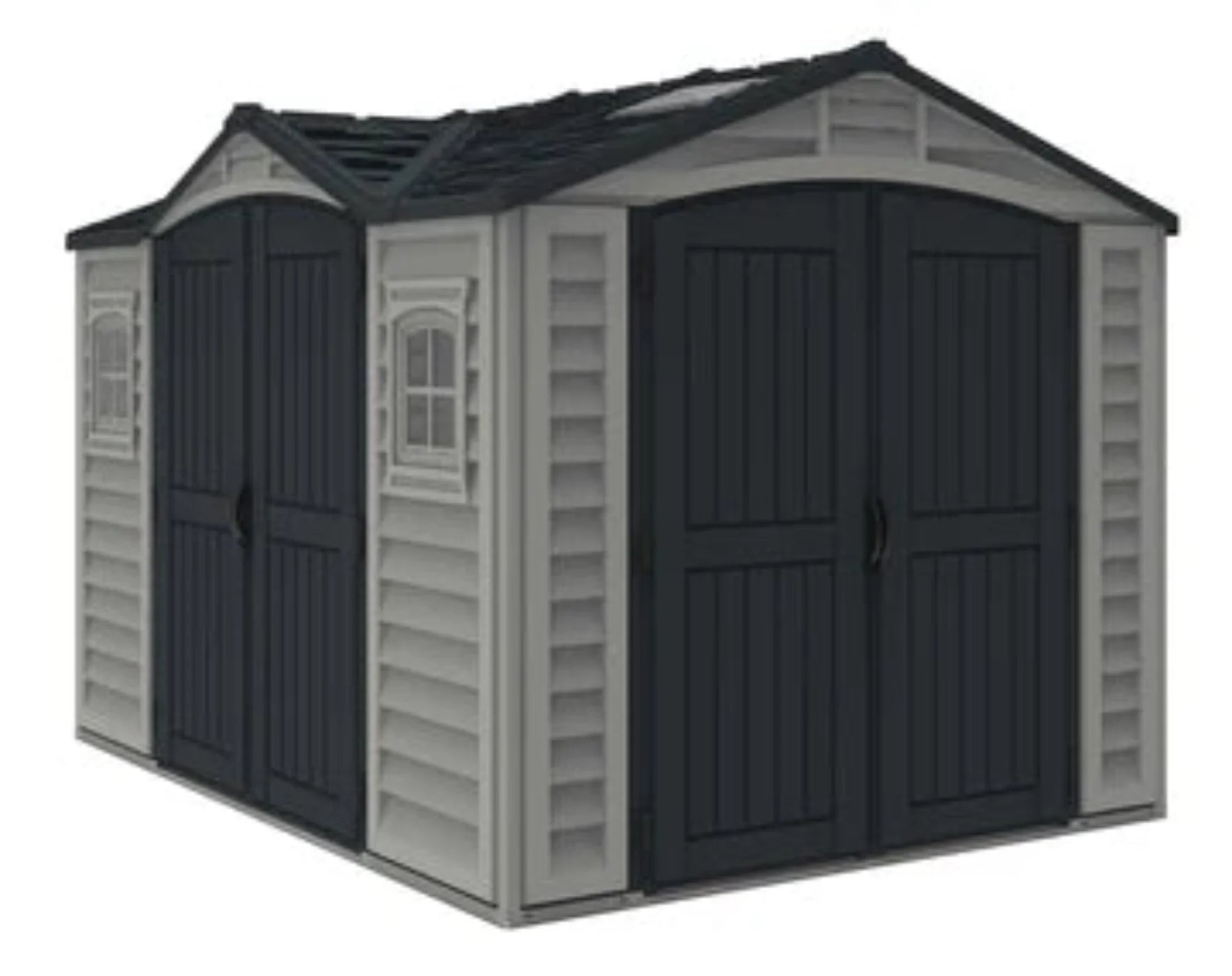 e 10.5 x 8 DuraMax Apex Pro shed is a high-quality, durable storage solution designed to fit seamlessly into any yard. This shed features large double doors at both the front and side, making it easy to access your stored items from multiple angles and fully utilize the available space. It is designed to enhance the look of any outdoor area and requires no maintenance, as it will not rust, rot, or require painting. Additionally, it is resistant to damage from insects. Natural light and ventilation are well-considered in the Apex Pro design, with two skylights and two front windows for light and four slotted vents for airflow. Reinforced with robust interior structures, the shed is crafted from fire-retardant vinyl resin panels supported by galvanized steel columns, beams, and trusses, ensuring strength to withstand heavy snow. This material is safer for storing flammable items compared to traditional polyethylene. With a 15-year warranty, the Apex Pro promises durable service, and it comes with a straightforward assembly guide, ideal for teamwork in setting up. A foundation kit is included, though wood needs to be purchased separately.