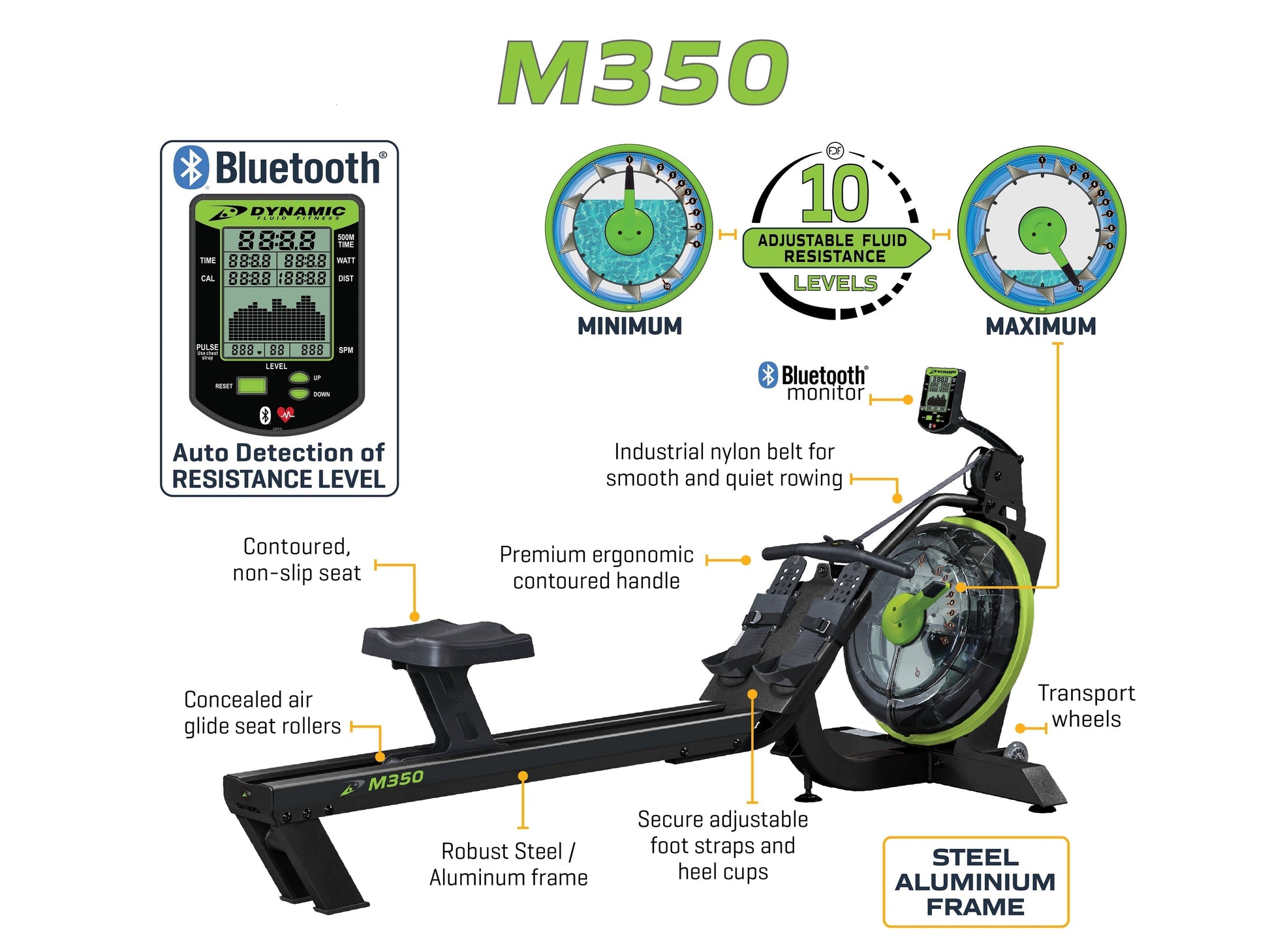 The Dynamic Fluid Fitness M350 Fluid Rower is designed to meet your fitness needs with its advanced features and commercial-grade quality.
