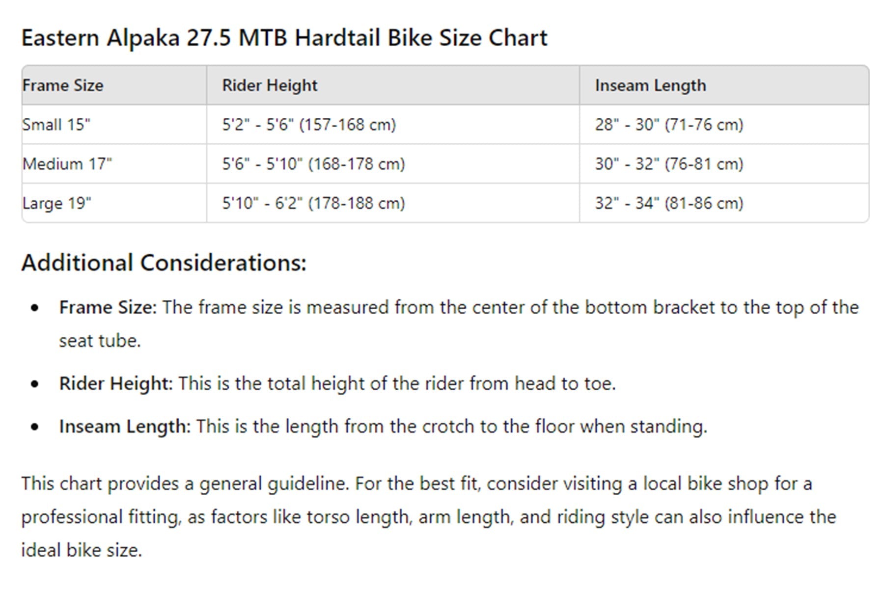 • Wheels: Eastern 27.5" Quick Release Hubs, 36h Black Double Wall Rim, Black Stainless Spokes Brass Nipples