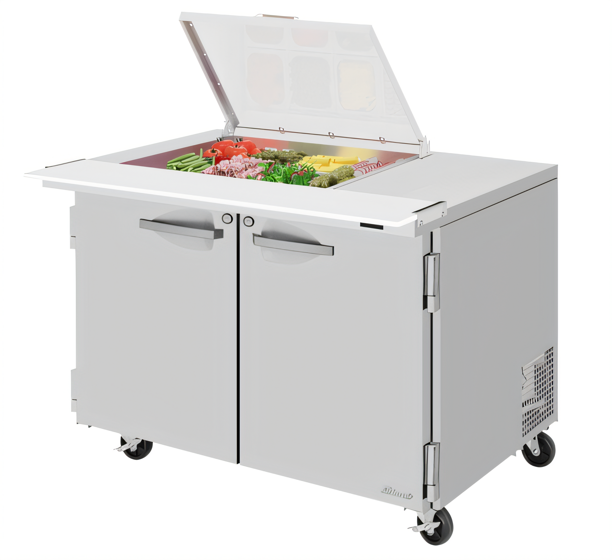 A: A 48″ PRO Series Mega Top refrigerated prep table with a flat clear lid, built for organized, high‑efficiency food prep in commercial kitchens.