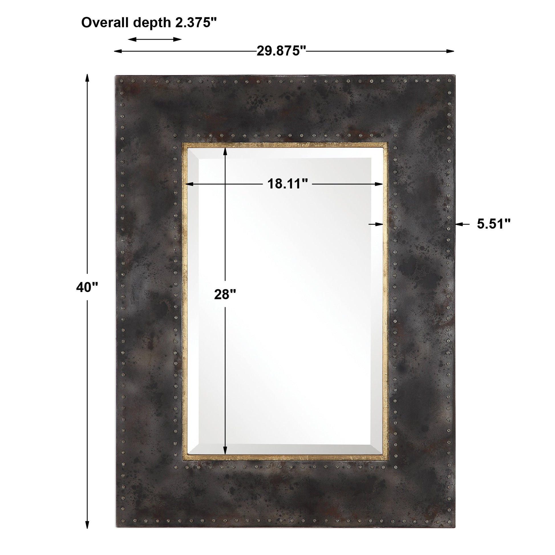 This industrial-style mirror features an oxidized steel gray finish with exposed brass nut and screw details, and a petite antiqued gold leaf inner frame. The generous 1 1/4" bevel allows for vertical or horizontal hanging. Uttermost produces mirrors with premium materials and unique styling, designed with shipping in mind and some of the industry's lowest damage rates.