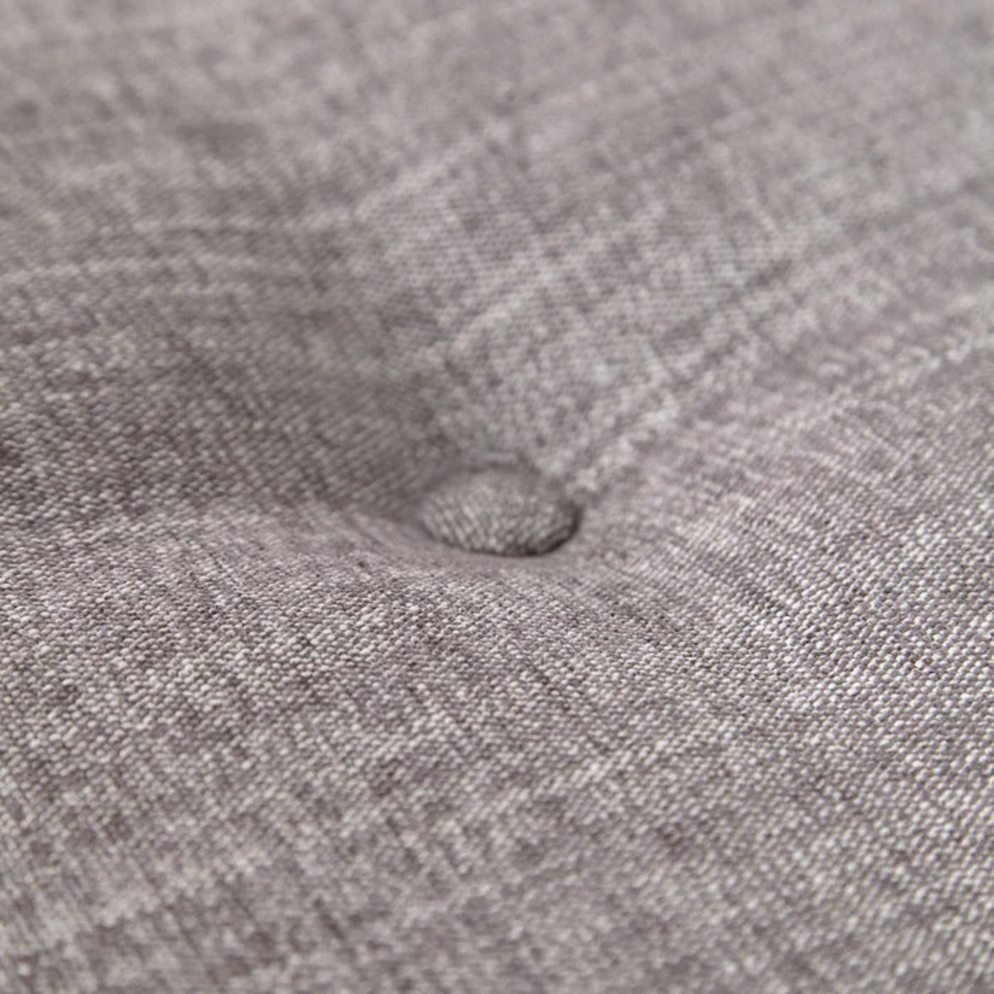 Plush button-tufted seat in taupe-brown linen-blend fabric provides a soft, inviting surface for seating or lounging.