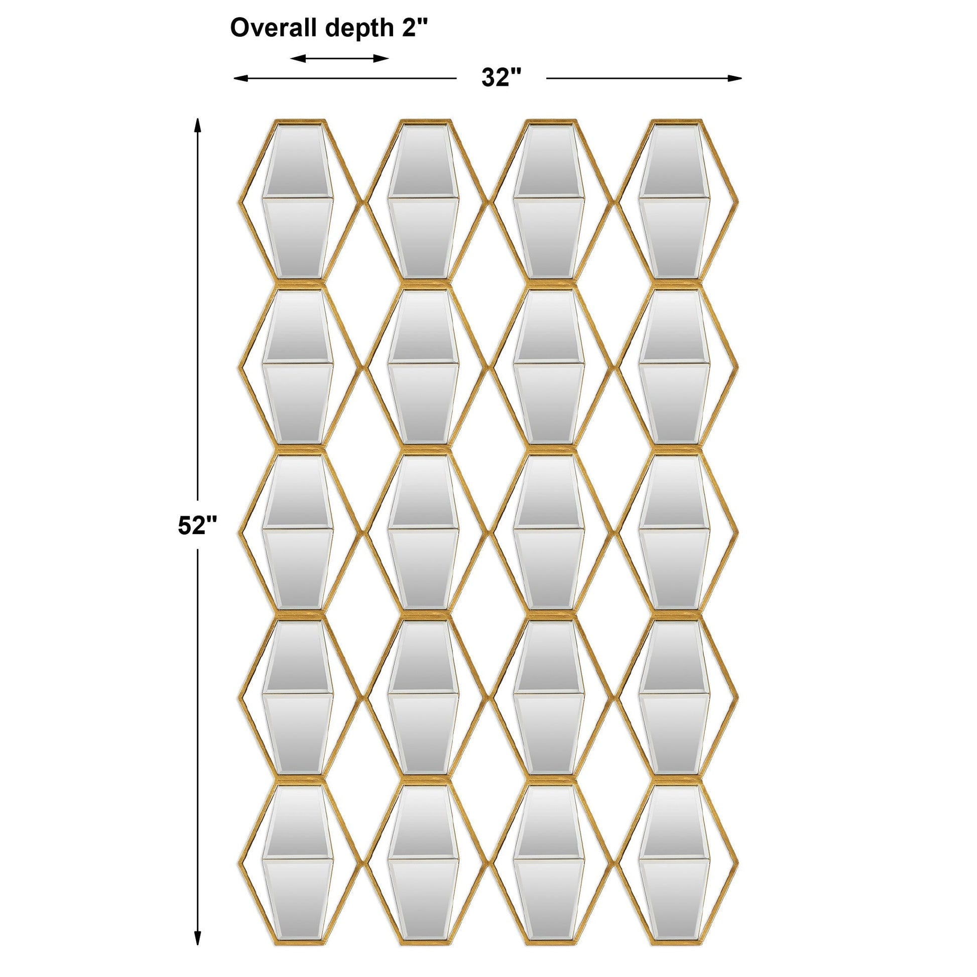 A: Measures 52″ H × 32″ W × 2″ D; made with an iron frame and beveled mirror panels.