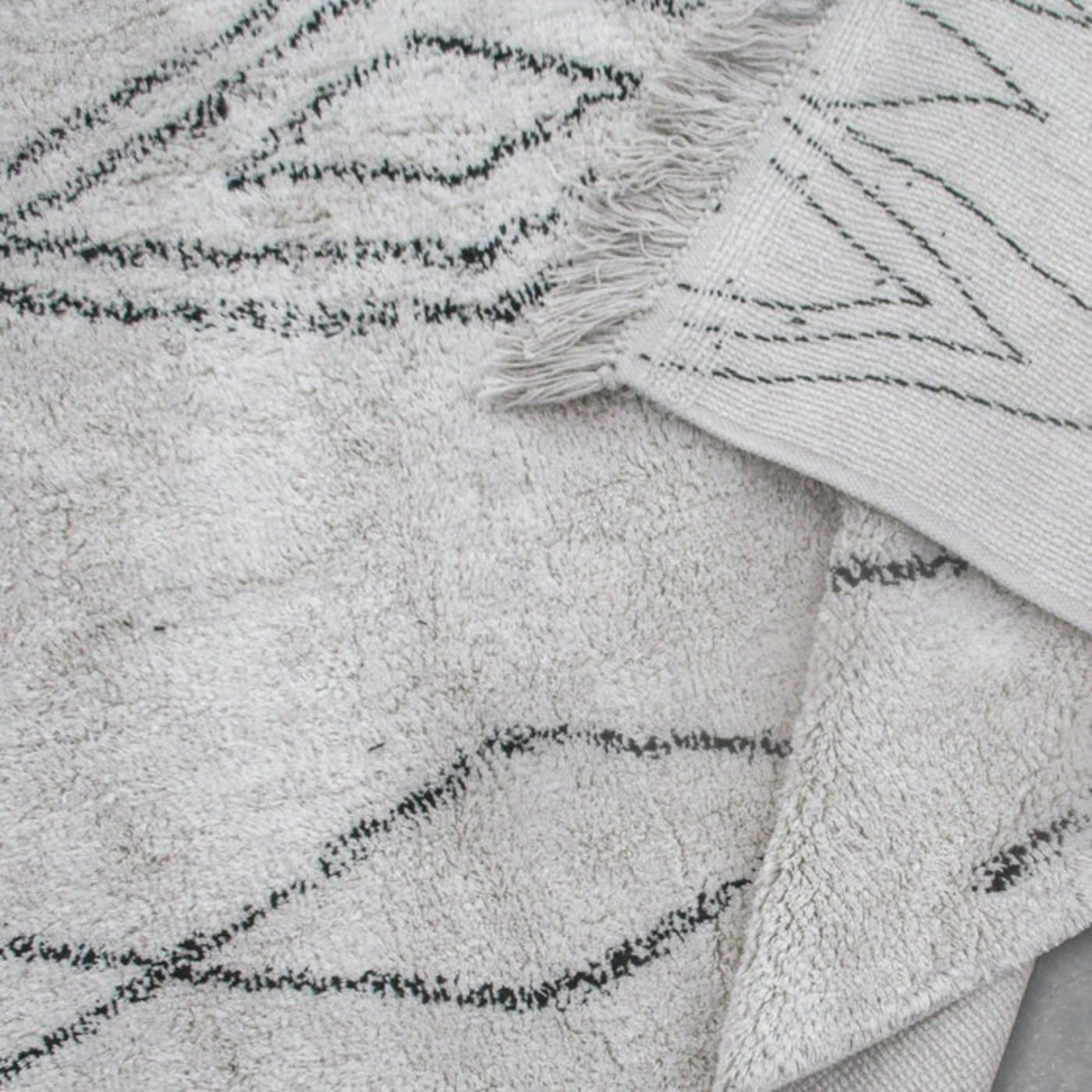 Table‑tufted cotton weave with a subtle charcoal tribal-inspired pattern on ivory offers understated decorative interest suitable for modern or transitional interiors. -
