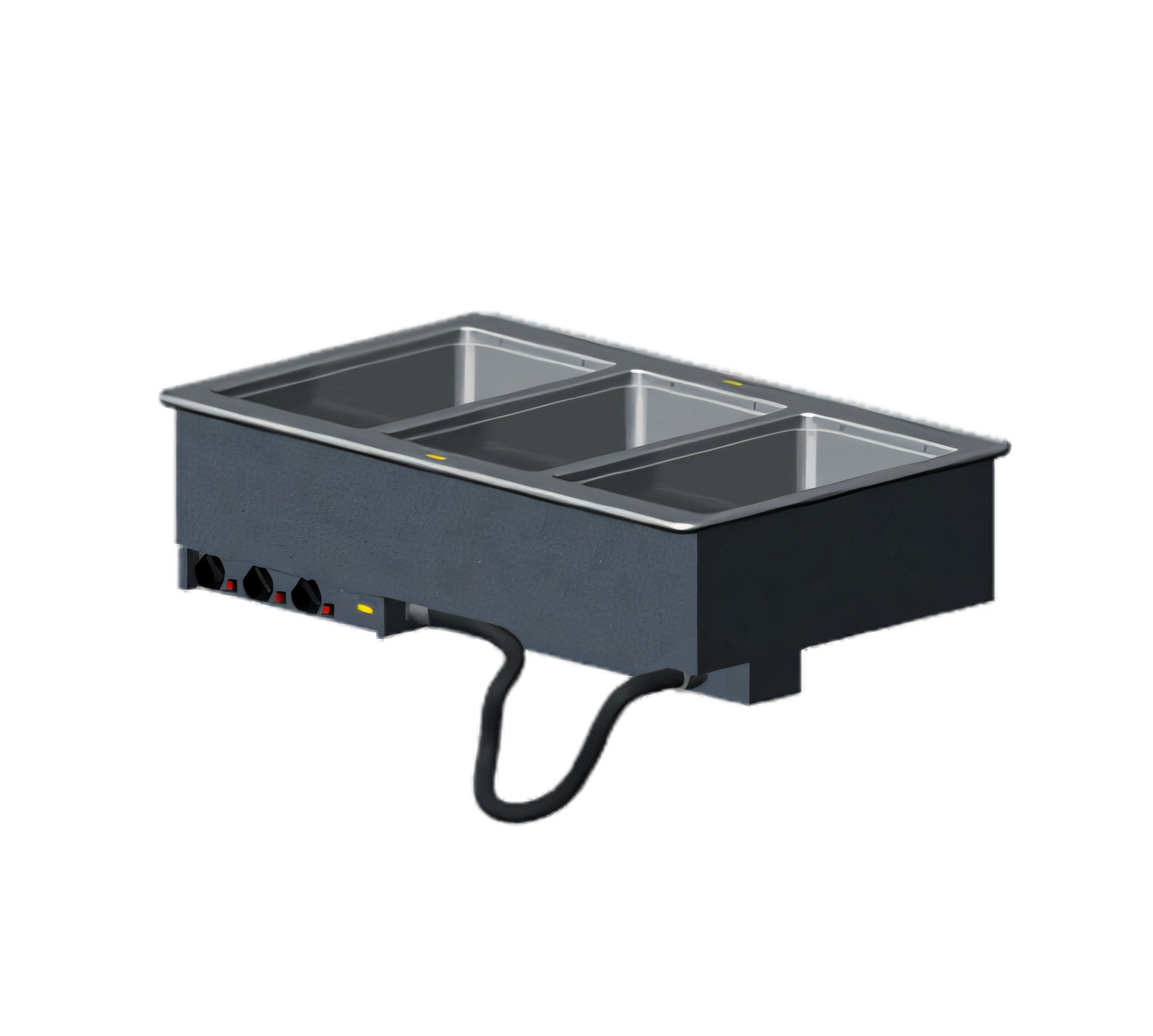 Three-well wet-bath drop-in holds full-size pans at safe, even temperatures.